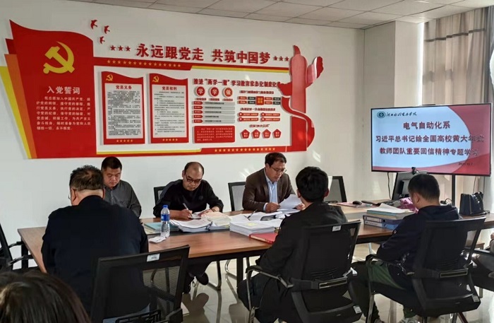 2021年10月7日,电气自动化系于弘文守正楼1229室组织专题会议学习贯彻习近平总书记给全国高校黄大年式教师团队重要回信精神,会议由电气自动化系党总支副书记赵晓毅主持,系党总支书记郑宝民、系主任唐勇、系副主任吉...
