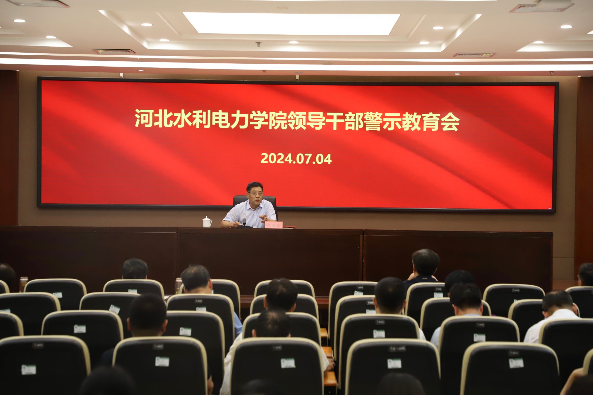7月4日,我校在弘文守正楼9楼报告厅召开领导干部警示教育会。党委书记张效松主持会议并讲授党纪教育专题党课,校领导班子成员、全体中层干部及马克思主义学院全体教师参加会议。会议首先播放了省纪委党纪教育专题片《紧绷纪律之弦》,张效松结合警示教育片内容及新修订的《中国共产党纪律处分条例》给大家讲授党课。他指出,全体党员、干部要深刻认识新修订的《中国共产党纪律处分条例》及党纪学习教育的重要意义,深入学习贯彻习近平总书记的重要讲话和重要指示精神,...