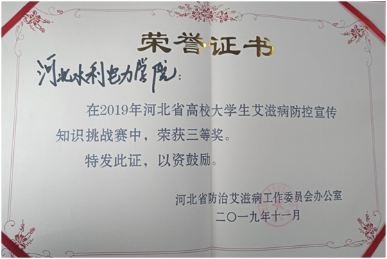 我校艾滋病防控工作再获殊荣,喜报连连。11月9日,我校代表队在后勤管理处的带领下赴石家庄参加了省卫生健康委举办的2019年河北省高校大学生艾滋病防控宣传知识挑战赛。本次比赛分为两轮,在第一轮“防艾知识竞答”比...